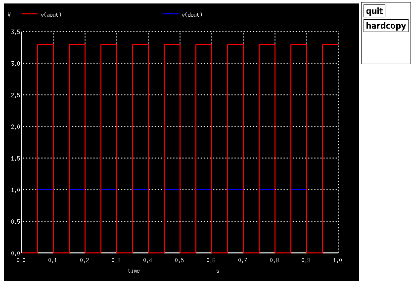 The .control block tells Ngspice to load the codemodel before parsing the circuit description (pre_codemodel). Afterwards the circuit is simulated with the command run and the results are plotted with the plot command. v(dout) is the digital voltage level measured on the connection between our clk module and the dac_bridge.
